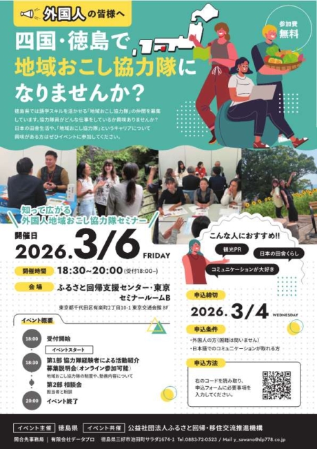 徳島県では、JET経験者の皆さんの知識や経験を活かしながら、多様な地域協力活動に取り組んでいただき、多文化共生社会の実現や地域活性化、さらには定住・定着の促進につなげていくことを目指しています。